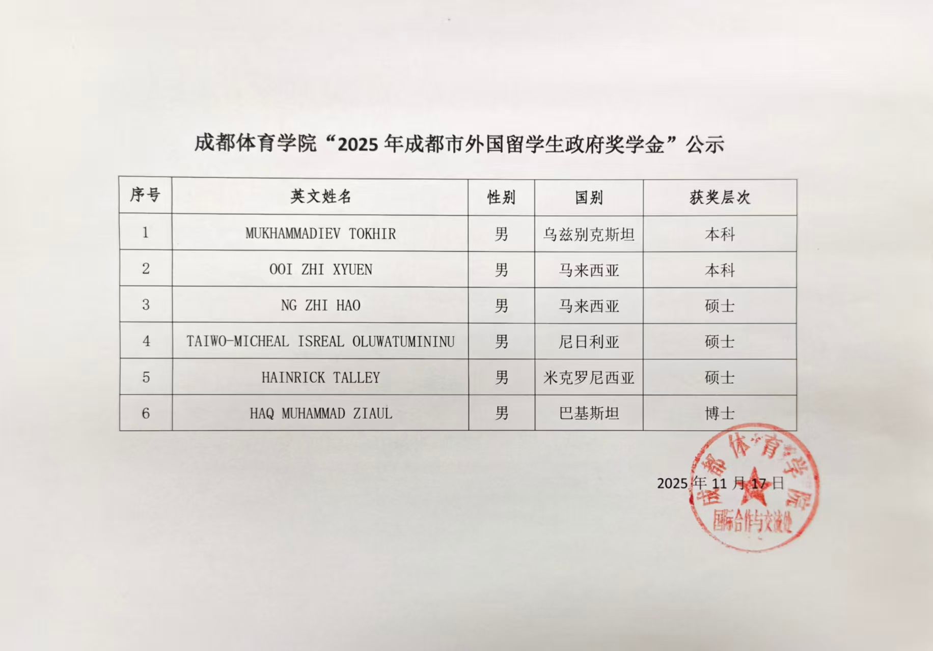 上一篇:成都体育学院“2025年四川省外国留学生政府奖学金”公示